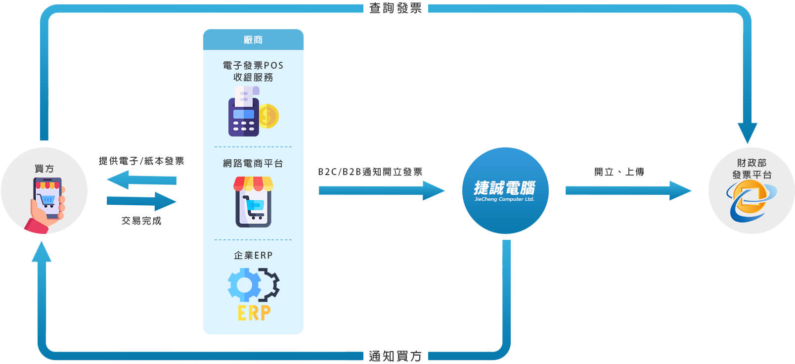電子發票POS收銀服務、網路電商平台、企業ERP) -->|B2B、B2C通知開立發票| C(捷誠電腦) A(買方) -->|查詢發票| D(財政部發票平台) C(捷誠電腦) -->|通知買方| A(買方) C(捷誠電腦) -->|開立、上傳| D(財政部發票平台)